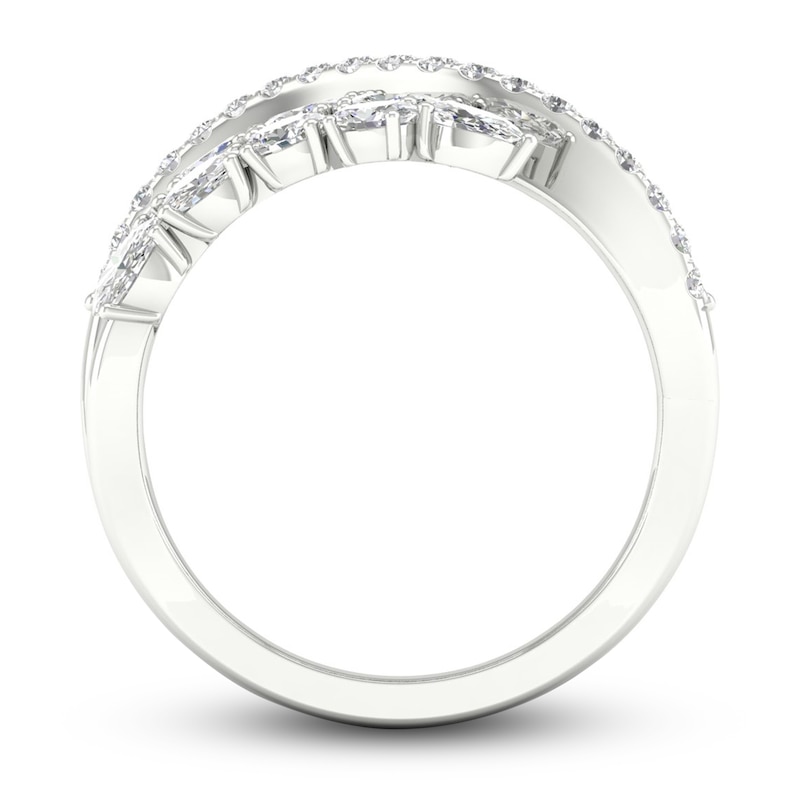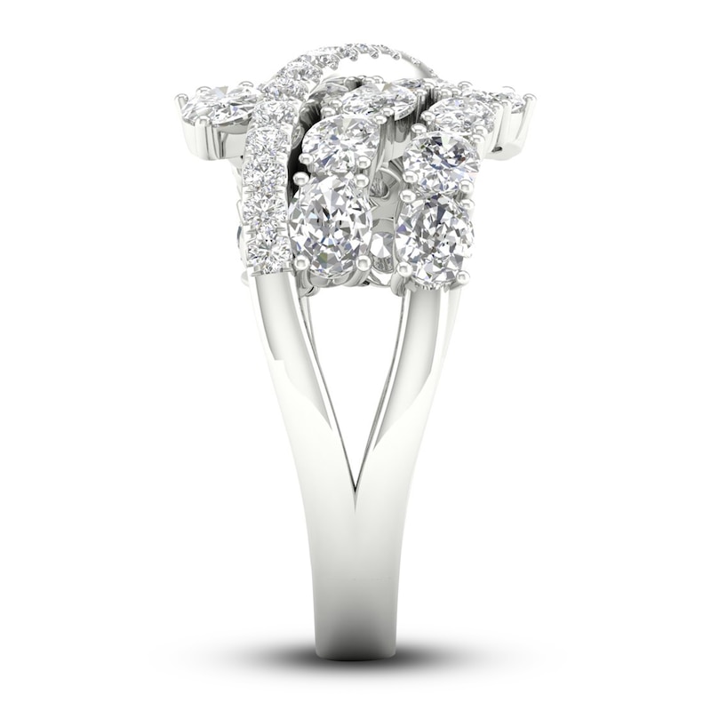 This exceptional bypass ring showcases shining rows of luminous oval-cut diamonds and a sweeping center row of round diamonds. Crafted in iconic 14K white gold, the dazzling ring has an impressive total diamond weight of 2 1/4 carats.