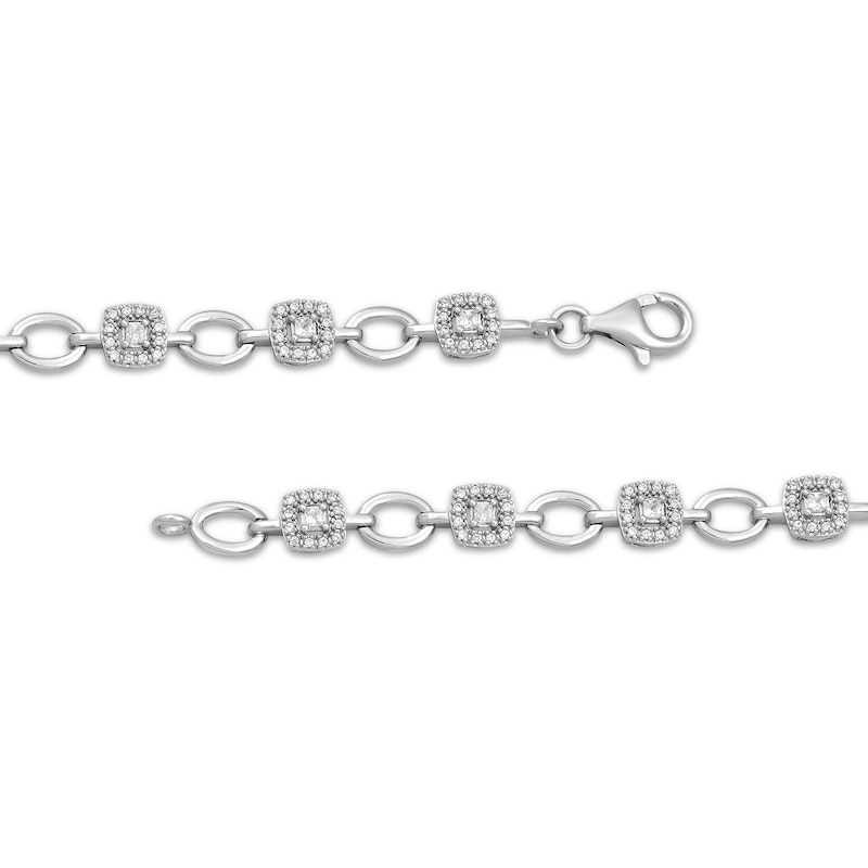 Dress your wrist with the elegant shine of this spectacular tennis bracelet. Created in 10K white gold, this look showcases links of princess-cut diamonds in cushion-shaped halos of round-cut diamonds and open oval links in an alternating link design. With a total diamond weight of 1/2 carat, this 7.25-inch bracelet secures with a lobster clasp.