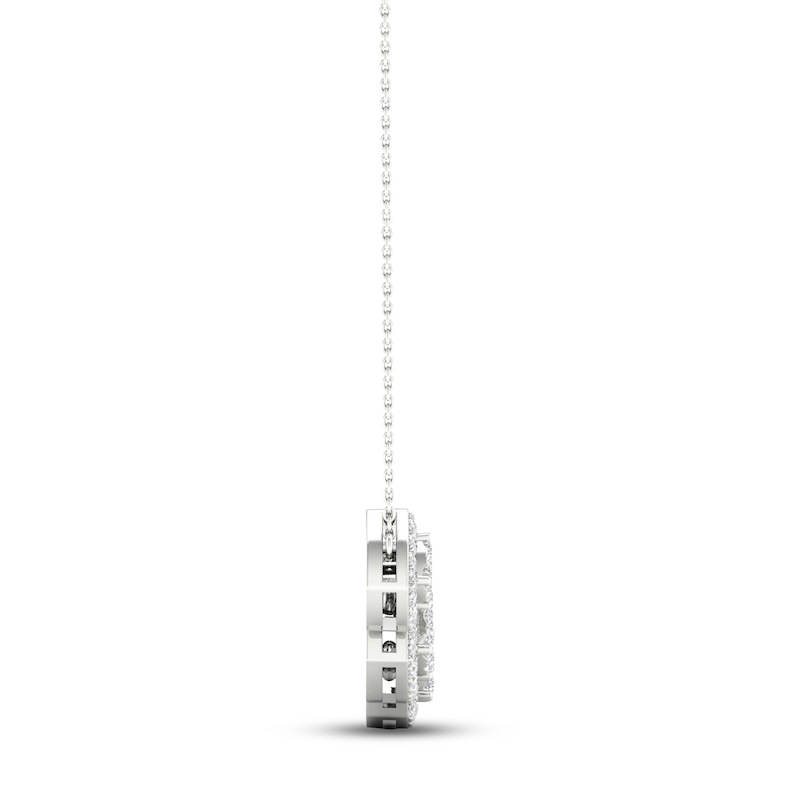 Gently graduating east to west, five cushion shapes adorn this exquisite 10K white gold necklace for her. Luminous round diamonds sparkle on each for a total diamond weight of 1/2 carat. The dazzling pendant suspends from an 18-inch cable chain that secures with a lobster clasp.