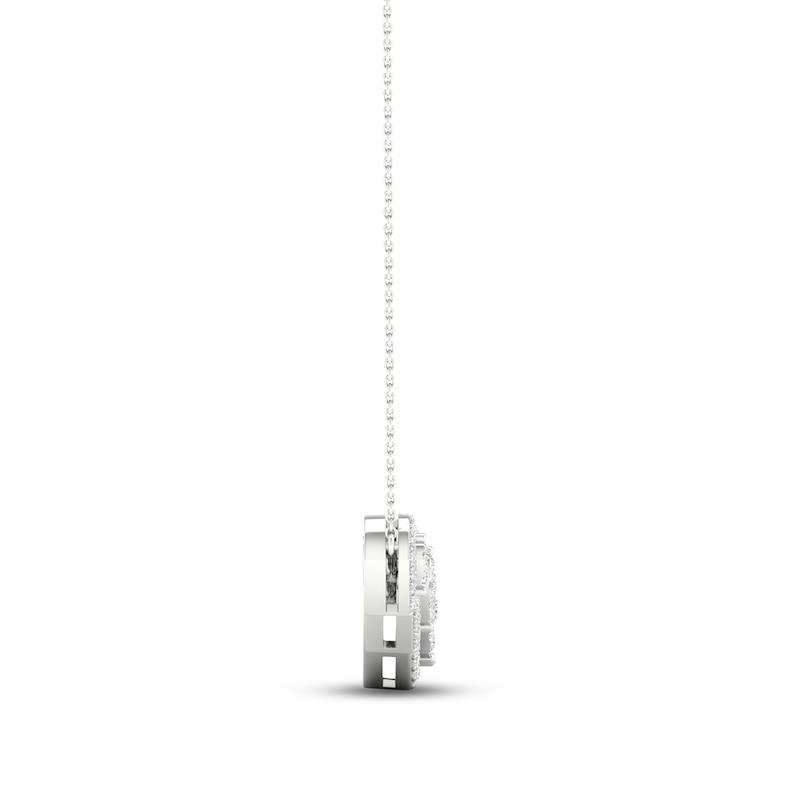Radiantly romantic, this necklace features five hearts subtly graduating from east to west. Styled in 10K white gold, sparkling round diamonds adorn each heart for a total diamond weight of 1/2 carat. The pendant suspends from an 18-inch cable chain that secures with a lobster clasp.