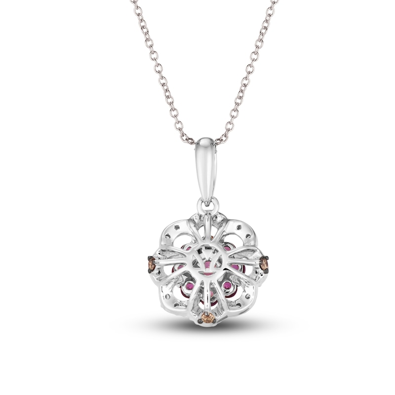 A Passion Ruby™ cluster outlined with sparkling Nude Diamonds™ forms the tempting center of this irresistible necklace from Le Vian®. Unexpected sprinkles of decadent Chocolate Diamonds® lend a delightful finish giving the ring a total diamond weight of 1/8 carat. The delicious necklace is created in sweet 14K Vanilla Gold®. The pendant suspends from an 18-inch cable chain and secures with a lobster clasp. Le Vian®. Discover the Legend.