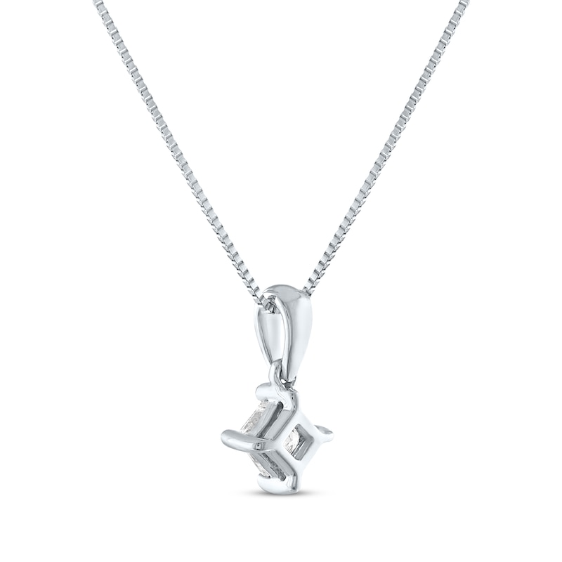 Topped with a fluted bail, this solitaire necklace is just the right touch of sparkle for your day. Created in 14K white gold, the drop features a tilted 1/3-carat princess-cut diamond that is independently certified and laser-inscribed with a unique Gemscribe® serial number to ensure your peace of mind. The pendant suspends along a box chain that secures with a lobster clasp and is adjustable from 16 to 18 inches.