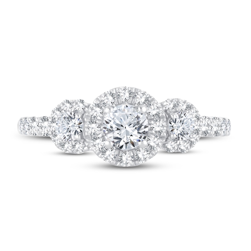 This stunning diamond engagement ring features a three-stone design, symbolizing your past, present and future in love. Set in iconic 14K white gold, three round diamonds grace the center, each haloed by brilliant round-cut diamonds. More round diamonds shimmer down the band, giving the ring a total diamond weight of 1 carat. From the Now & Forever® bridal collection.