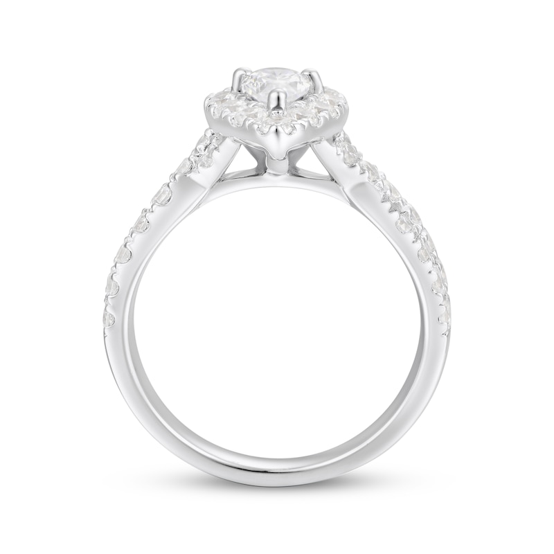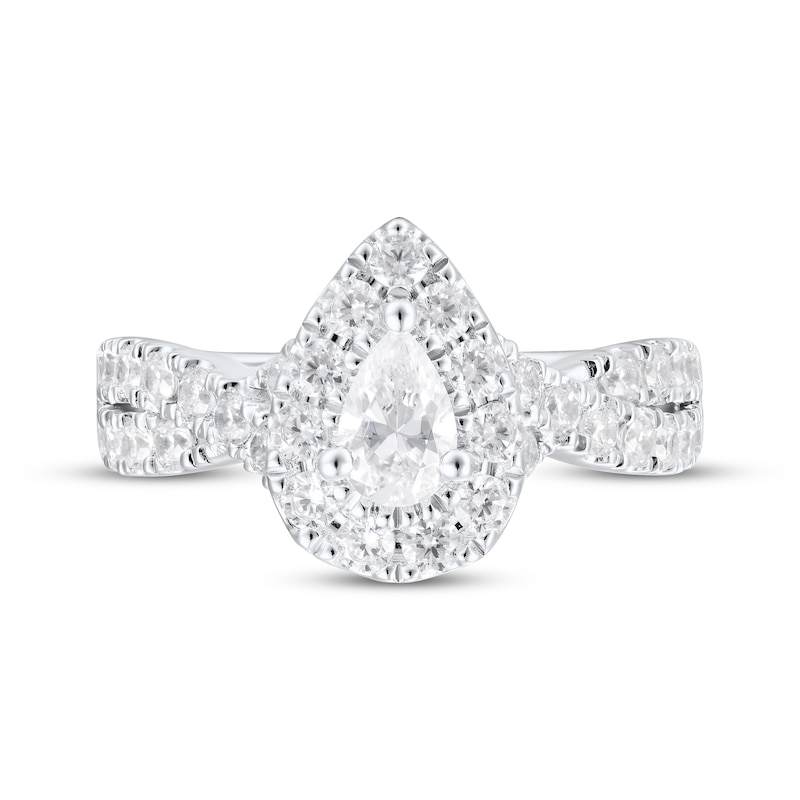A stunning 1/2-carat pear-shaped diamond sparkles at the center of this chic engagement ring. Set in iconic 18K white gold, brilliant round diamonds halo the center and shimmer down the twisted band. The ring has a total diamond weight of 1 1/2 carats and is from our Now & Forever® bridal collection.