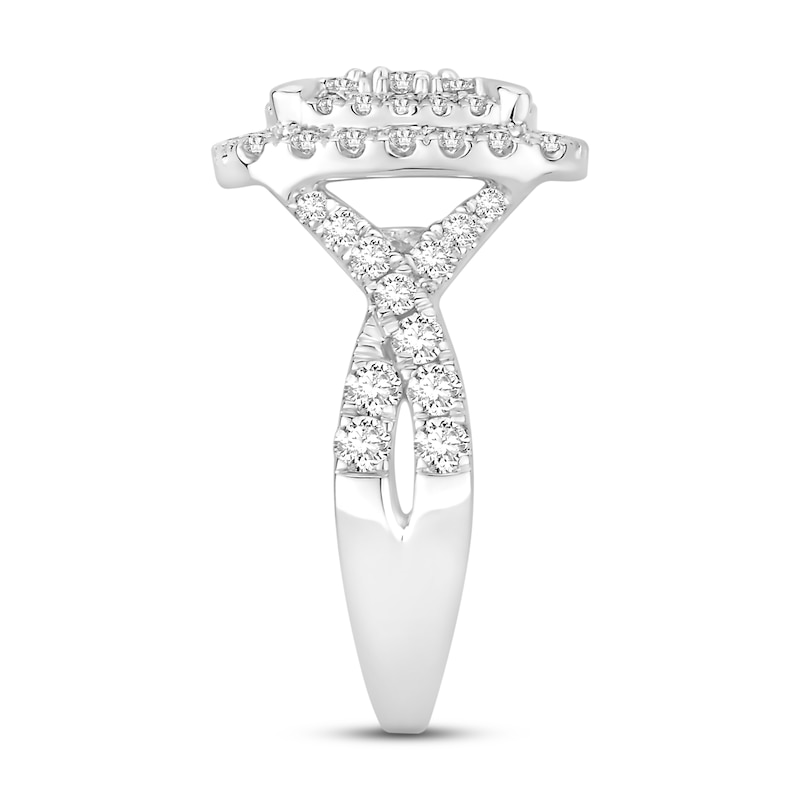 A round diamond sparkles at the center of this dazzling engagement ring, surrounded by a host of shimmering round diamonds that continue down the iconic 14K white gold band. The ring has a total diamond weight of 1 1/2 carats and is from our Now and Forever® bridal collection.