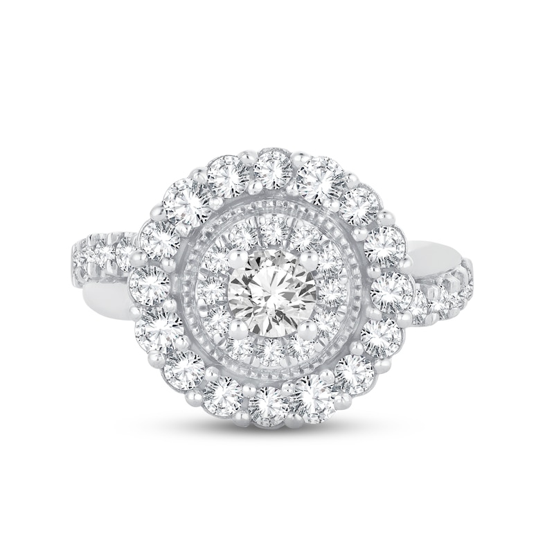 This splendid engagement ring showcases a sparkling 2/5-carat round-cut diamond. A double-halo of round diamonds shimmers around the center, and additional round diamonds glitter along the twisting band. Styled in iconic 14K white gold with a rhodium finish, the ring has a total diamond weight of 1 1/2 carats. From the Now and Forever® bridal collection.