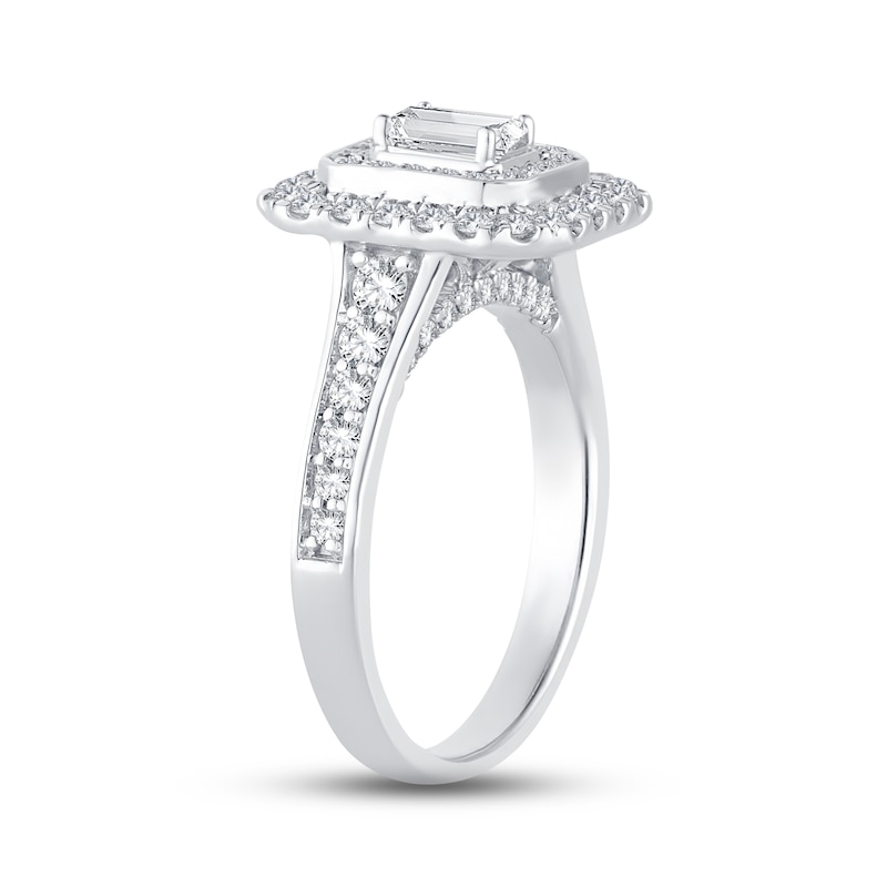 You found "the one" — celebrate your forever love with a beautiful diamond engagement ring! A regal emerald-cut diamond radiates from the center when embraced by two shimmering frames of brilliant round-cut diamonds. The stunning center is perched amidst a classic band traced in more sparkling round diamonds. Styled in 14K white gold, the ring has a total diamond weight of 1 1/4 carats and is from our Now & Forever® bridal collection.