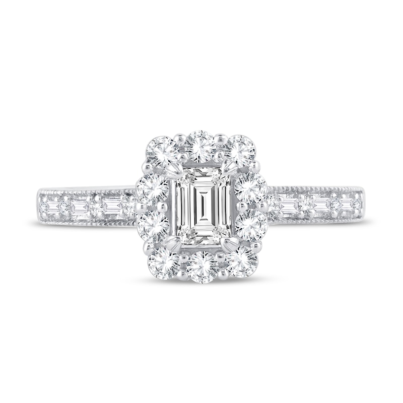 A stunning 1/4-carat emerald-cut diamond shines at the center of this classic engagement ring. Set in iconic 14K white gold, brilliant round diamonds halo the center, and the sides of the band sparkle with alternating round and baguette-cut diamonds. Milgrain detailing finishes the design, and the ring has a total diamond weight of 3/4 carat. From the Now & Forever® bridal collection.