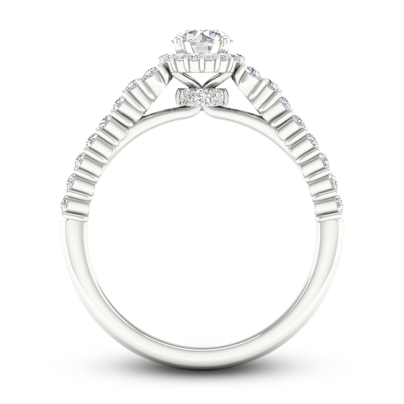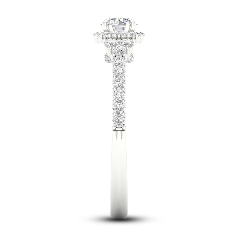 A gorgeous 1/3-carat round diamond sparkles at the center of this dreamy engagement ring for her. Set in beautiful 14K white gold, brilliant round diamonds halo the center and more shimmer down the sides of the band. The ring has a total diamond weight of 3/4 carat. From the Now & Forever® bridal collection.