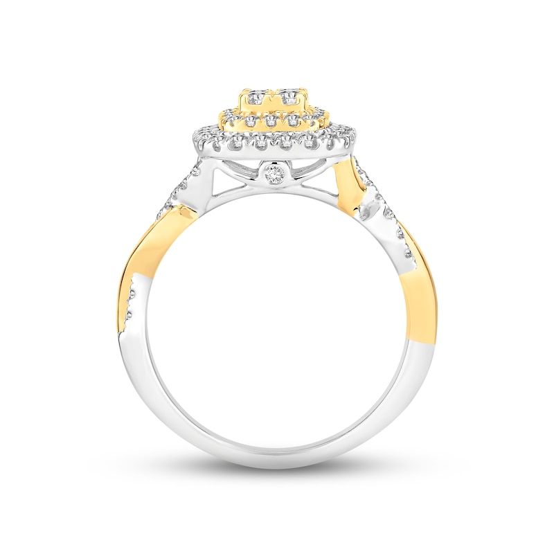 Styled in 14K yellow and 14K white gold for a sensational two-tone look, this beautiful engagement ring features a dazzling array of round-cut diamonds at the center. More round diamonds shimmer down the gracefully twisting two-tone band, bringing the total diamond weight to 5/8 carat. From the Now & Forever® bridal collection.