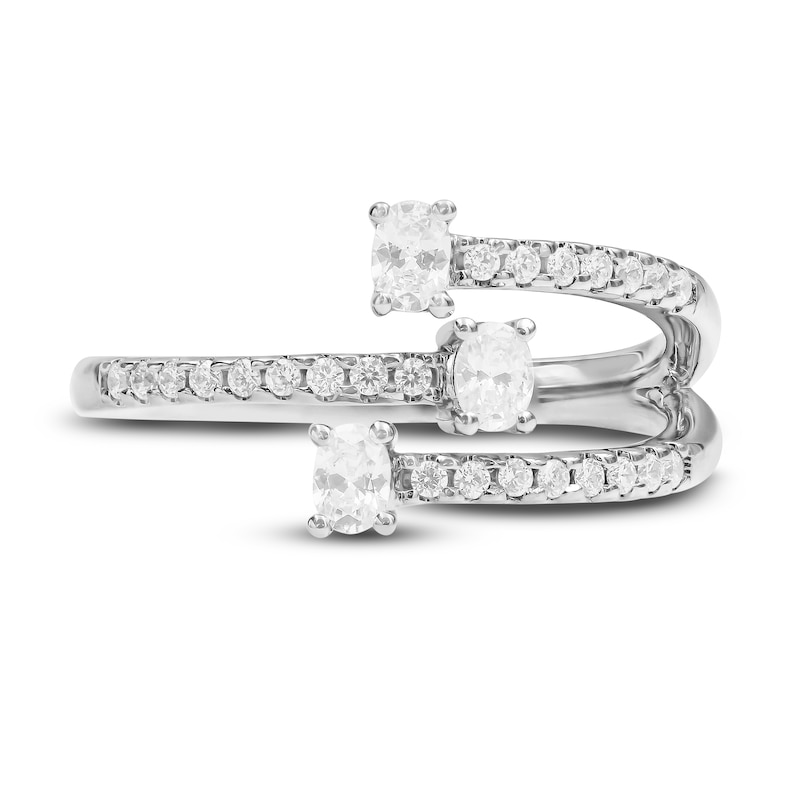 This dazzling ring features a chic deconstructed design embellished by a trio of glittering oval-cut diamonds. Delicate round diamonds adorn the lustrous 10K white gold band for a total diamond weight of 1/2 carat.