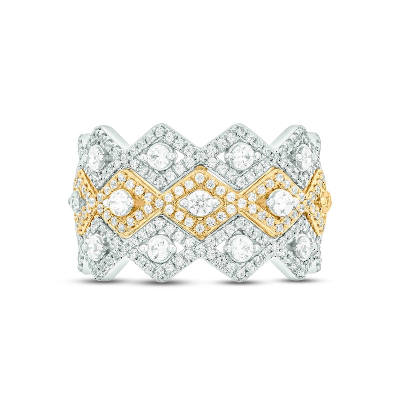 This modern ring features a bold zigzag design arrayed in radiant round-cut diamonds. Styled in 10K white gold with 10K yellow gold for eye-catching contrast, the ring has a total diamond weight of 1 carat.