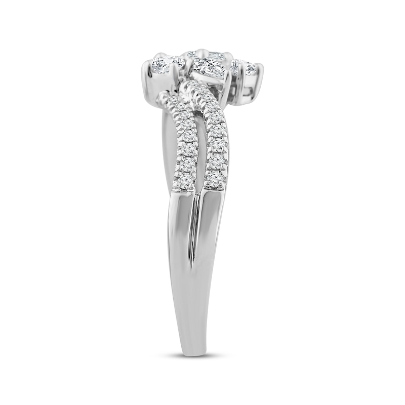 This enchanting diamond ring from the Everything You Are™ collection features five distinctively-shaped diamonds, symbolic of everything she means to you. Each diamond shape has a different meaning, from integrity and wisdom, to confidence, totality, and elegance. The beautiful 10K white gold ring features an oval-cut, emerald-cut, pear-shaped, round-cut, and princess-cut diamond at the center, while ribbons of brilliant round-cut diamonds flow outward. The gorgeous ring has a total diamond weight of 1/2 carat.