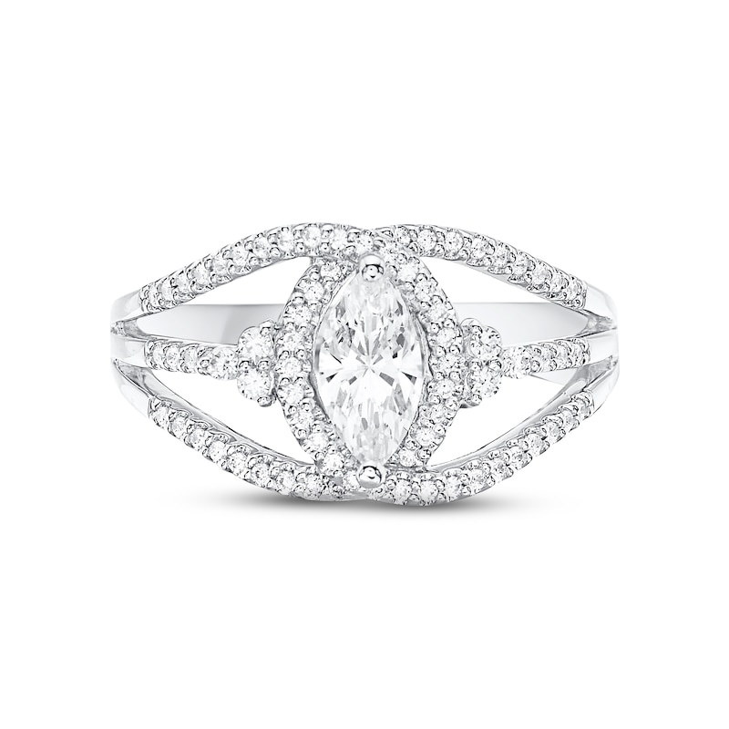 An eye-catching marquise-cut lab-created diamond shines at the center of this gorgeous ring, crafted in 14K white gold. Ribbons of round lab-created diamonds wrap around the center and flow along the openwork band for all-over sparkle. The ring has a total lab-created diamond weight of 3/4 carat, and the lab-created diamonds are independently certified. From the Lab-Created Diamonds by KAY collection.