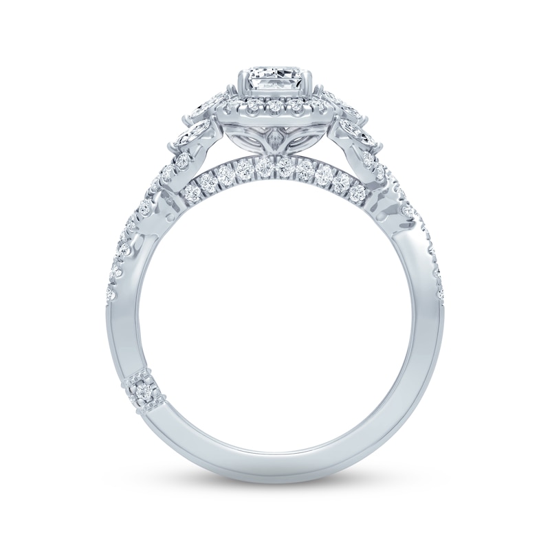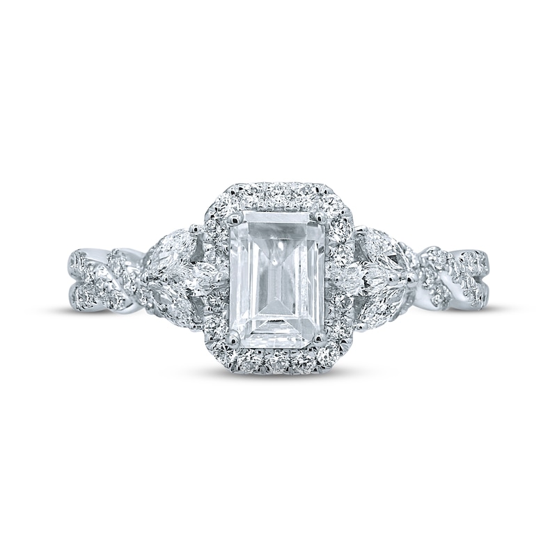 This luxurious engagement ring from the Monique Lhuillier Bliss collection features a showstopping 3/4-carat emerald-cut diamond framed by dazzling round diamonds. Trios of marquise diamonds flank the center, and additional round diamonds cascade down the sides of the twisted band. Styled in 18K white gold, the ring has a total diamond weight of 1 3/8 carats. From the Monique Lhuillier Bliss collection, available exclusively at KAY. Please note: This ring is available in limited sizes. If you don't see your size here, please visit a store to order your ring.