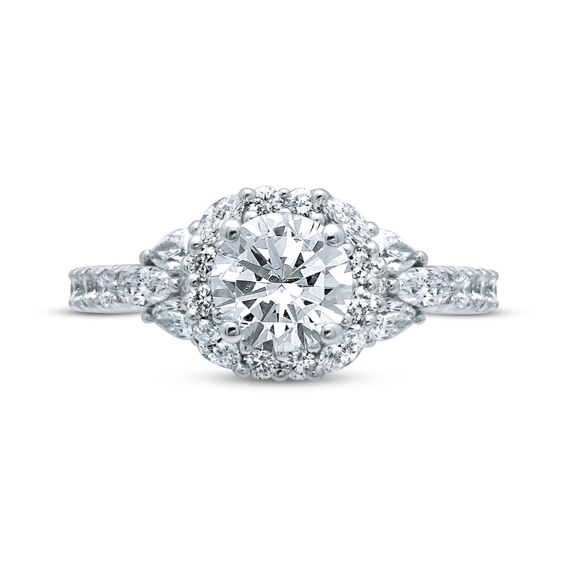 This magnificent engagement ring features a dazzling 1-carat round-cut diamond haloed in round and marquise diamonds. Marquise and pear-shaped diamonds sparkle on the sides, and delicate round diamonds trace the top and sides of the band. Styled in iconic 18K white gold, the ring has a total diamond weight of 1 7/8 carats. From the Monique Lhuillier Bliss collection, available exclusively at KAY. Please note: This ring is available in limited sizes. If you don't see your size here, please visit a store to order your ring.
