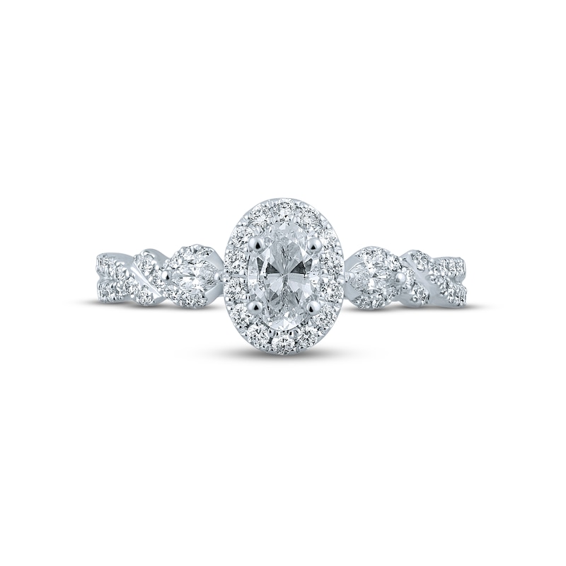 A beautiful 1/2-carat independently-certified oval-cut diamond shines at the center of this chic engagement ring. Set in iconic 18K white gold, brilliant round diamonds halo the center diamond. Stunning marquise-cut diamonds flank each side, and more round diamonds weave down the twisted band for a total diamond weight of 7/8 carat. From the Monique Lhuillier Bliss collection, available exclusively at KAY. Please note: This ring is available in limited sizes. If you don't see your size here, please visit a store to order your ring.
