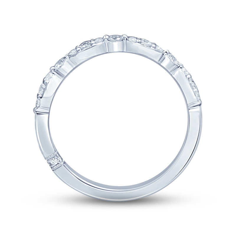 This beautiful wedding band features round diamonds that shimmer along a curving silhouette. Styled in 18K white gold, the ring has a total diamond weight of 1/4 carat and is crafted to pair with her matching engagement ring (sold separately). From the Monique Lhuillier Bliss collection, available exclusively at KAY. Please note: This ring is available in limited sizes. If you don't see your size here, please visit a store to order your ring.