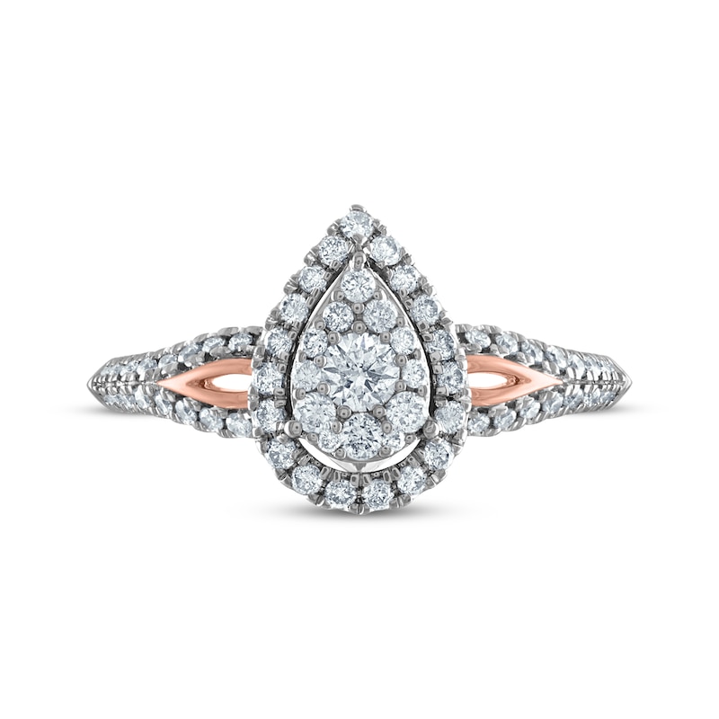 Shining with romantic details, this engagement ring is sure to win her heart. Styled in 10K white gold, a radiant round-cut diamond shines amid smaller round diamonds on the pear-shaped composite center. More round diamonds create a shimmering frame and dazzle down the split shank, which is embellished by beautiful 10K rose gold accents. The charming two-tone ring has a total diamond weight of 1/2 carat. From the Now & Forever® bridal collection.