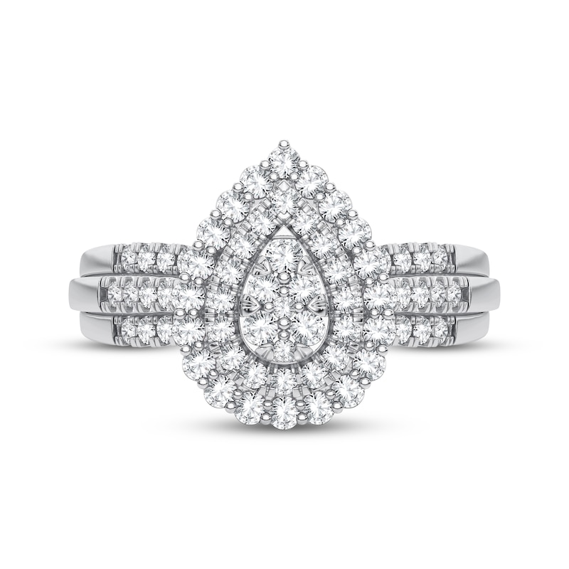 This magnificent engagement ring showcases an array of round diamonds shimmering on the composite center. A double halo of round diamonds surrounds the pear-shaped, gently scalloped silhouette. Three rows of round diamonds sparkle partway down the band, which is crafted in cool 10K white gold. The ring has a total diamond weight of 1/3 carat and is from our Now & Forever® bridal collection.