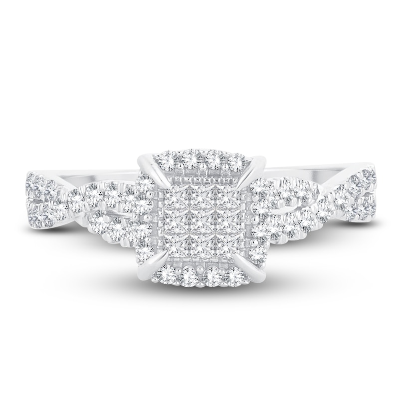 Nine stunning princess-cut diamonds combine for an eye-catching square center design in this composite engagement ring for her. Set in iconic 14K white gold, brilliant round diamonds halo the center and and weave down the twisted band for a total diamond weight of 1/2 carat. From the Now & Forever® bridal collection.