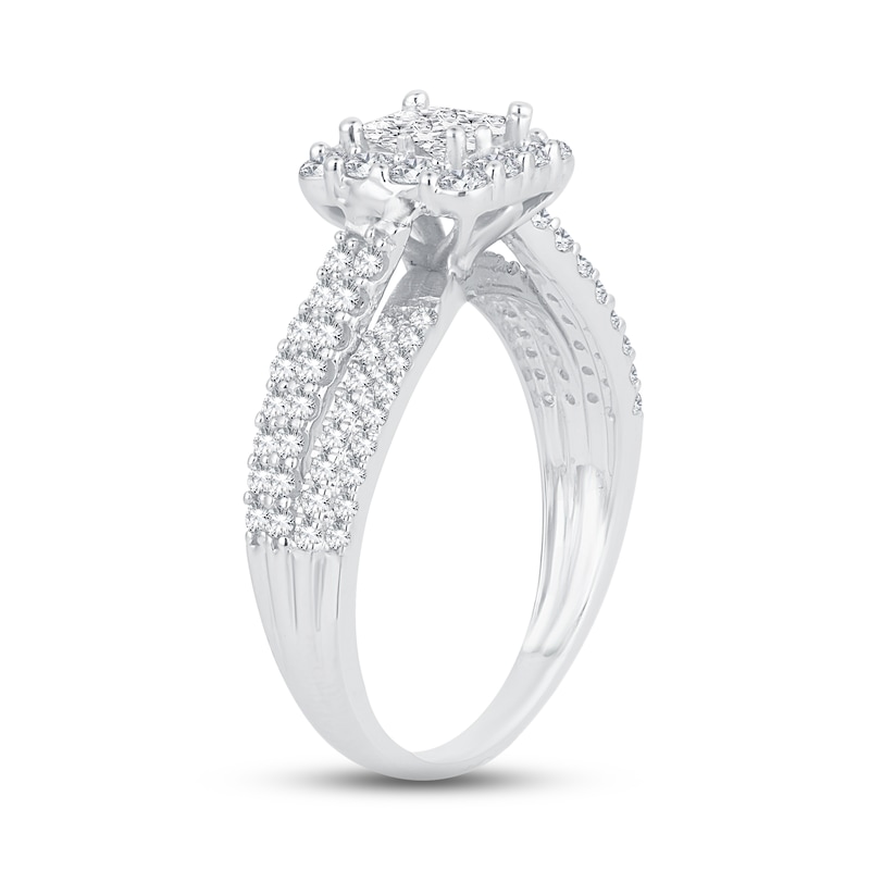 A quad of stunning princess-cut diamonds combine for the sparkling center in this beautiful multi-diamond engagement ring. Set in iconic 14K white gold, brilliant round diamonds halo the center and sparkle down the band in multiple ribbons. The ring has a total diamond weight of 1 carat and is from our Now & Forever® bridal collection.
