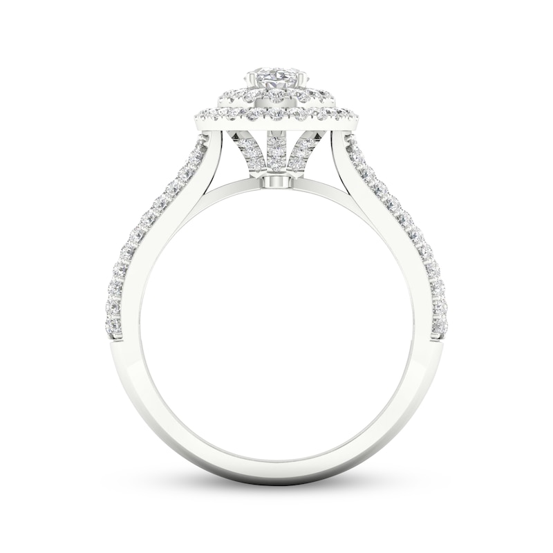 Let your love glow with this exceptional engagement ring. This design showcases a 1/2 carat oval-cut diamond surrounded by two round-cut diamond frames. Smaller round diamonds flank the centerpiece along the wide multi-row shank. Crafted in 14K white gold, this dazzling design has a total diamond weight of 1 1/4 carats. From the Now & Forever® bridal collection.