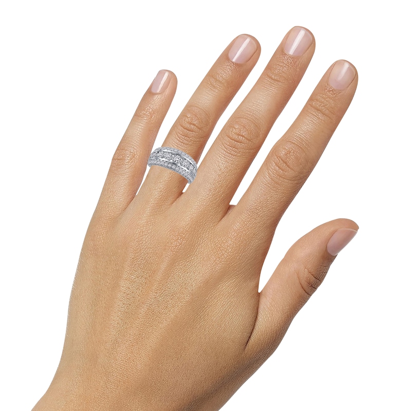 Honor a milestone in your forever love with this gorgeous anniversary ring. Set in classic 10K white gold, the ring sparkles with three rows of brilliant round diamonds. The ring has a total diamond weight of 1 carat. Available online while supplies last. Previously Owned Treasures are not eligible for in-store pickup. Previously Owned Treasures may only be shipped either to your home address or to an alternate address. Price comparison based on new item pricing.