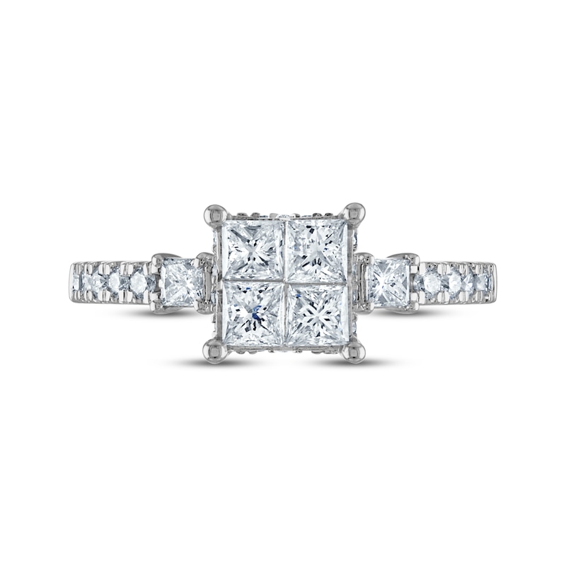 Ask the big question with this modern engagement ring. Crafted in 14K white gold, the design is centered with a quartet of princess-cut diamonds and flanked by princess-cut diamonds. Underneath, a ribbon of round-cut diamonds assures sparkle from every angle. More round-cut diamonds line the shank for a total diamond weight of 1 carat. From the Now & Forever® bridal collection.