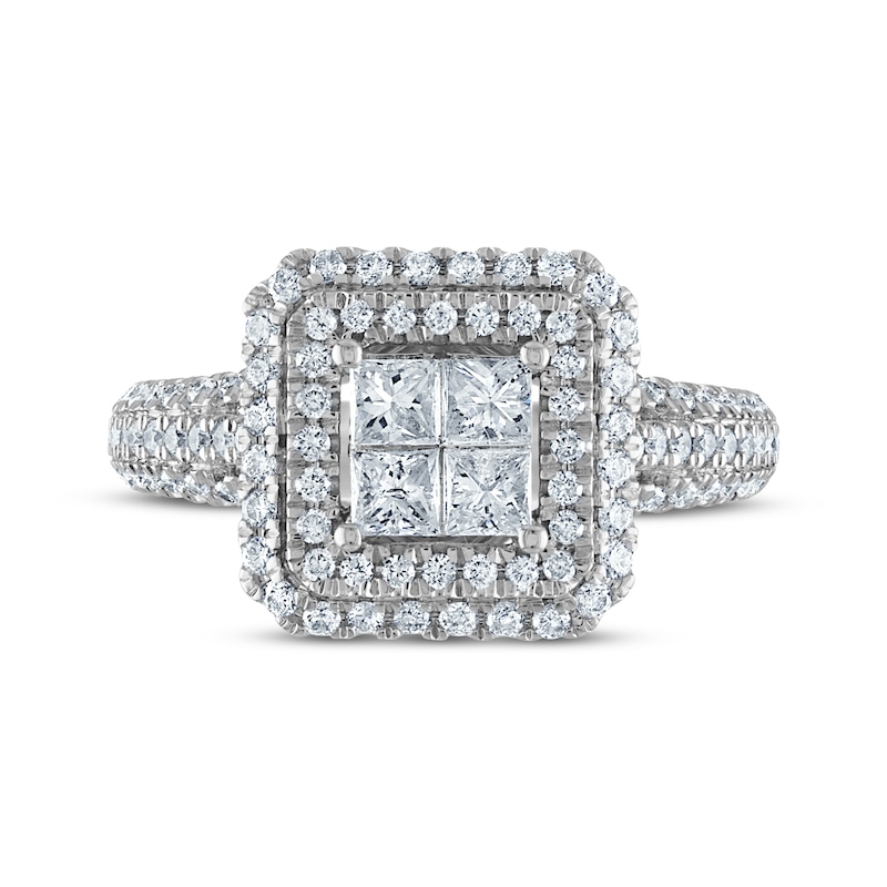 Wow them with the big look of this sparkling engagement ring. Crafted in 14K white gold, the design is centered with a quartet of princess-cut diamonds. Dual cushion-shaped frames of round-cut diamonds halo the center stones, while more round-cut diamonds line the two-row shank. This perfect style has a total diamond weight of 1 carat. From the Now & Forever® bridal collection.