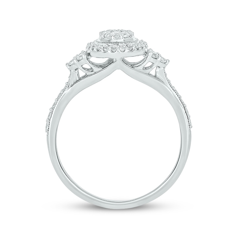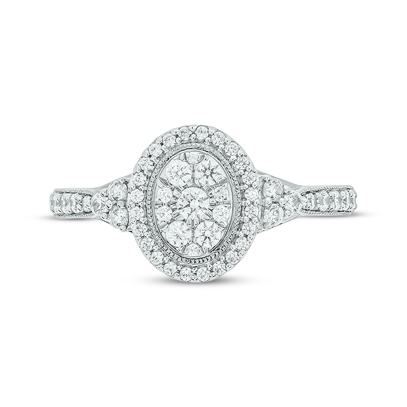 Make a stunning statement with this striking engagement ring. Created in 14K white gold, the design showcases an oval-shaped composite of round-cut diamonds embraced by a milgrain frame. Trios of round diamonds flank the centerpiece, while more glistening round diamonds line the milgrain-detailed shank. The ring has a total diamond weight of 1/2 carat. From the Now & Forever® bridal collection.