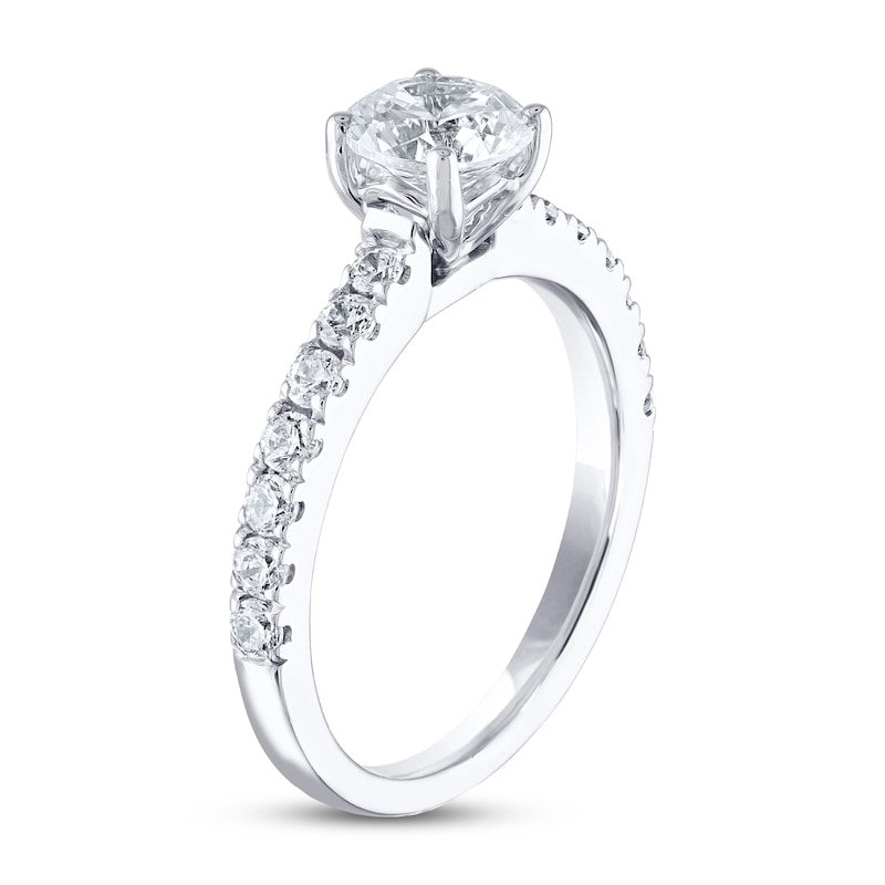 A dazzling display of love and light, this THE LEO Diamond® ring features a large round diamond at the center and sparkling round diamonds along the band. The stunning center 1-carat diamond has at least three Very High ratings on the GemEx Light Performance Report. Crafted of 14K white gold, the ring has a total diamond weight of 1 3/8 carats. The primary diamond is independently certified and is laser-inscribed with a unique Gemscribe® serial number for your peace of mind.