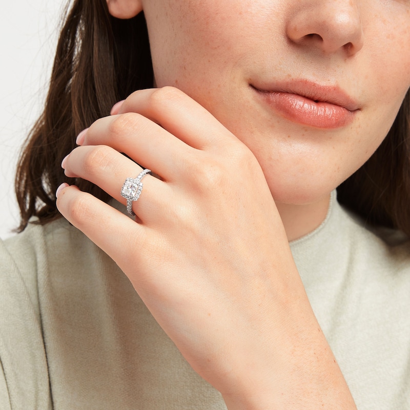 This stunning engagement ring showcases a 1-carat princess-cut First Light® diamond at its center. From Leo Schachter, the independently certified diamond features Fire Prism™ technology that creates infinite flashes of color for more fire and sparkle. Brilliant round diamonds halo the center stone, and more diamonds adorn the band to finish the breathtaking design. Crafted of 14K white gold, the ring has a total diamond weight of 1 3/8 carats. The center diamond is laser-inscribed with a unique Gemscribe® serial number to ensure your peace of mind. Live Your Love in Color.™