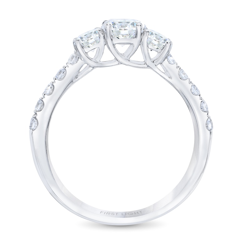 This gorgeous three-stone engagement ring for her showcases three brilliant round-cut First Light® diamonds, set in iconic 14K white gold. From Leo Schachter, the three diamonds feature Fire Prism™ technology that creates infinite flashes of color for more fire and sparkle. Brilliant round-cut diamonds sparkle down the band for a total diamond weight of 1 carat. The diamonds are independently-certified, and the center diamond is laser-inscribed with a unique Gemscribe® serial number to ensure your peace of mind. Live Your Love in Color.™