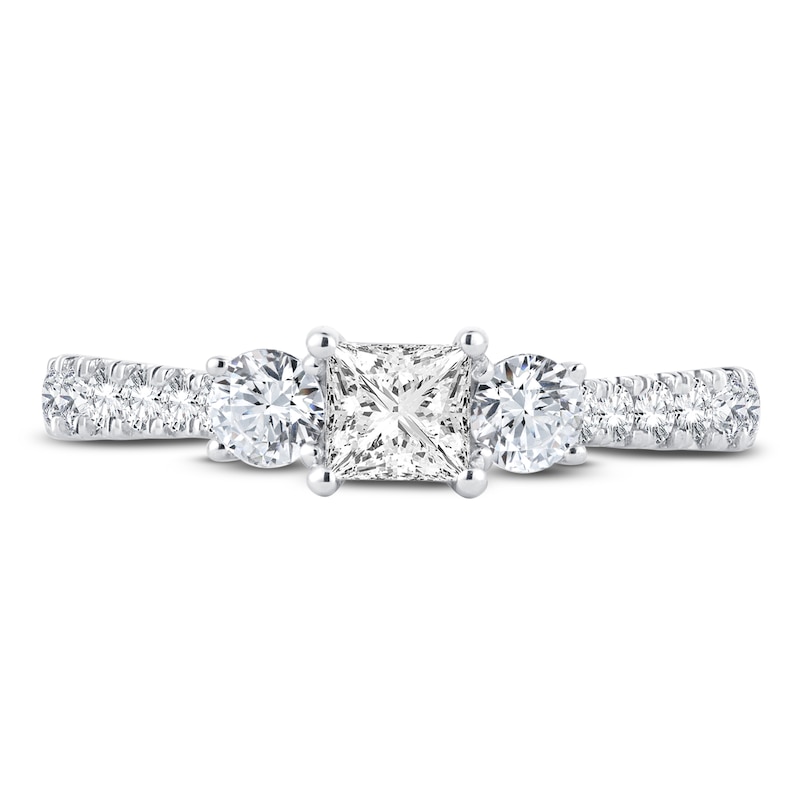 Made for your milestone moment, this gorgeous engagement ring symbolizes your past, present and future together. An enchanting princess-cut diamond is framed by two brilliant round-cut diamonds. For a delightful finish, additional round diamonds trace the classic silhouette. Styled in 14K white gold, the ring has a total diamond weight of 1 carat and is from our Now & Forever® bridal collection.