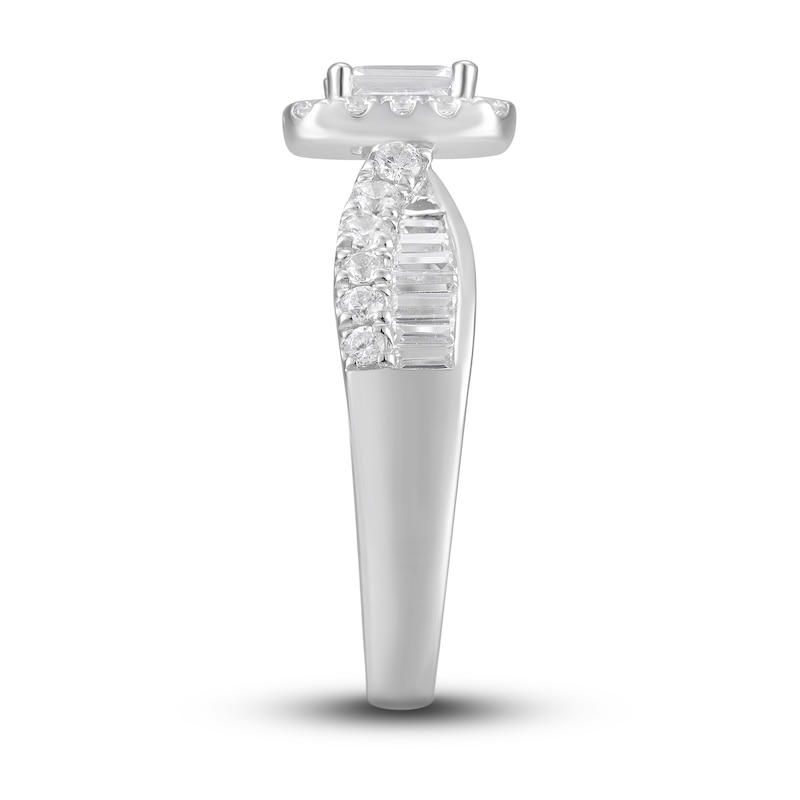 Diamond Engagement Ring 1-1/4 ct tw Emerald, Baguette & Round White Gold Plated