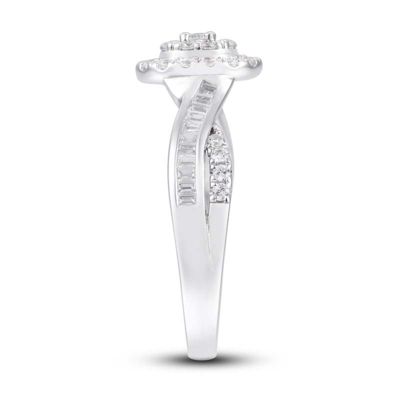Diamond Engagement Ring 1/2 ct tw Round & Baguette White Gold Plated