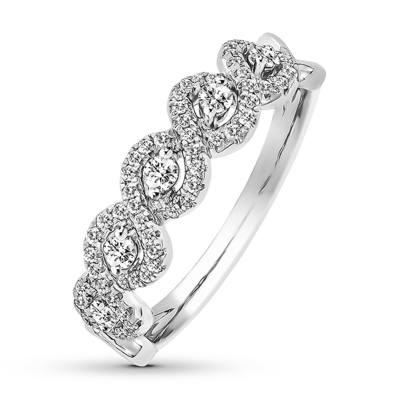 This lovely anniversary band showcases a row of round diamonds enveloped by twists of shimmering diamonds. The 14K white gold ring has a total diamond weight of 1/3 carat. From the Now & Forever® Bridal Collection.