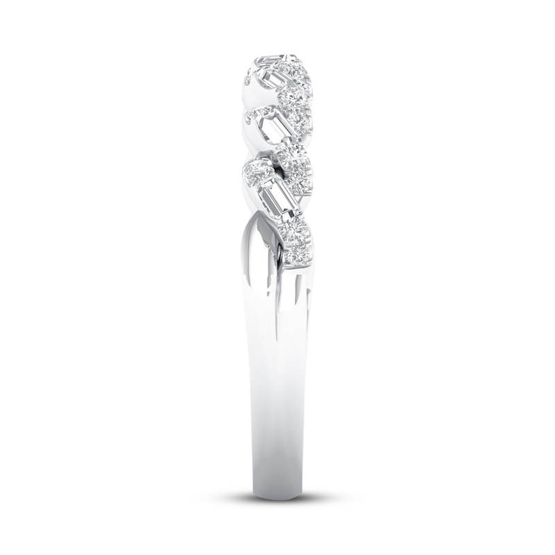 Celebrate the love you have for each other with this wonderful diamond anniversary ring for her. Styled in 14K white gold, the ring features shimmering twists of alternating round and baguette-cut diamonds to give the ring a total diamond weight of 1/3 carat. From the Now & Forever® bridal collection.