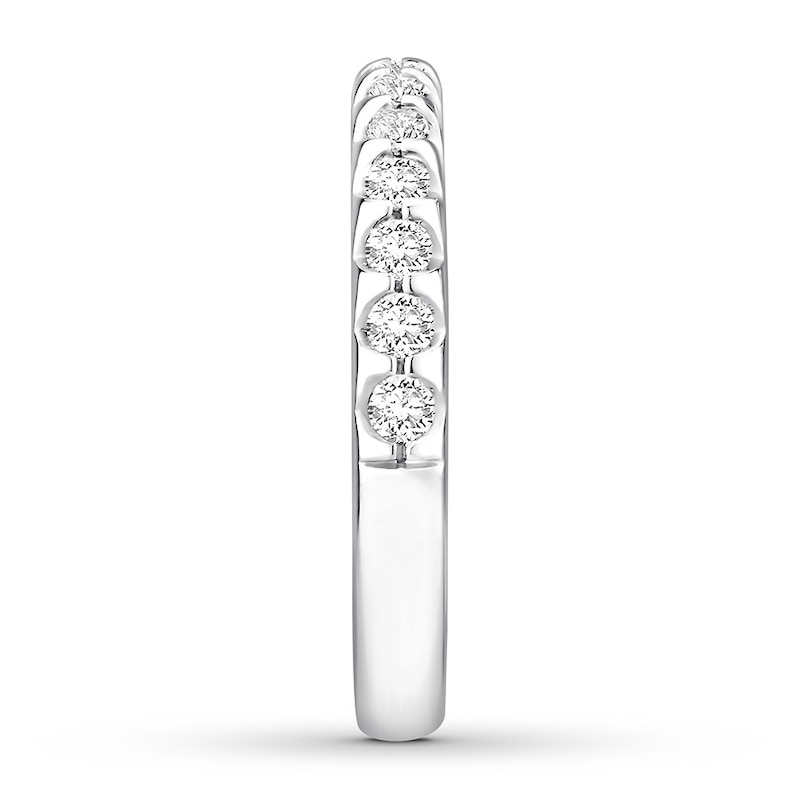 Round diamonds dance along this beautiful wedding band for her. Styled in 14K white gold, the ring will be a sparkling reminder of your love day after day. The diamonds total 1/2 carat in weight.