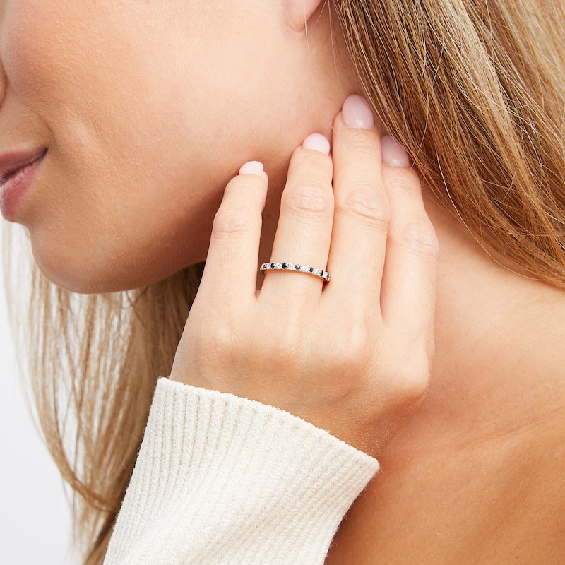 Sparkling round-cut black and white diamonds alternate along this striking anniversary ring from Neil Lane Bridal®. Styled in 14K white gold, the ring has a total diamond weight of 1/2 carat.