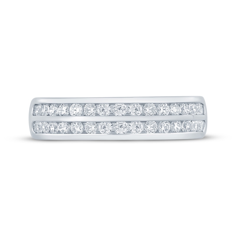 Surprise and delight with this dazzling anniversary band. Crafted in 14K white gold, the elegant style showcases two rows of channel-set round-cut diamonds. This ring has a total diamond weight of 1/2 carat. From the Now & Forever® bridal collection.