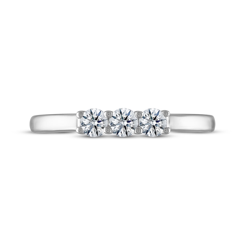 THE LEO® Ideal Cut Diamond is a rare diamond of geometrically perfect proportions that releases the maximum amount of fire, sparkle and brilliance – to let your unique love for each other truly shine through. Crafted in 14K white gold, this stylish three-stone wedding band features a trio of independently certified Ideal Cut diamonds for a total diamond weight of 1/3 carat.