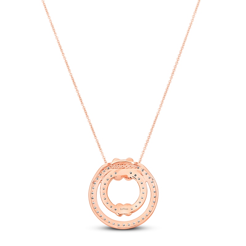 This luscious necklace from Le Vian® features a pair of rings frosted with sparkling Nude Diamonds™. Chocolate Diamonds® are sprinkled throughout the "x" accents for a delicious finishing touch. The 14K Strawberry Gold® necklace has a total diamond weight of 7/8 carat. The pendant hangs from an 18-inch cable chain and secures with a lobster clasp. Le Vian®. Discover the Legend.