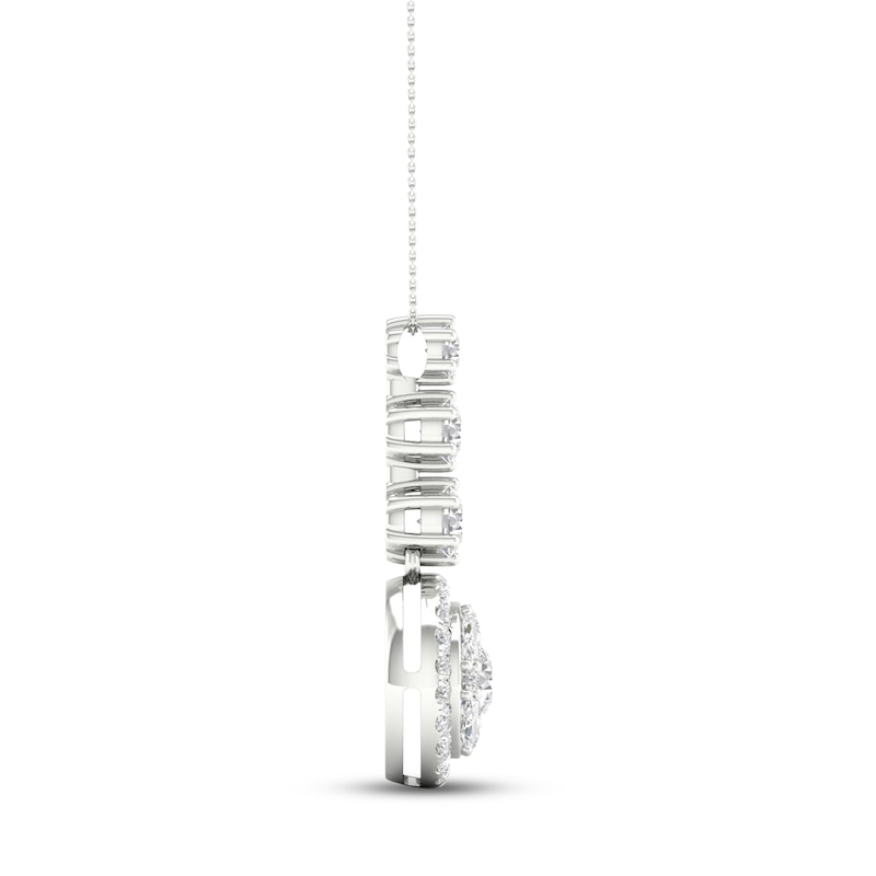 This dazzling necklace showcases a vertical row of three graduating round diamonds suspended over a circular pendant adorned in marquise and round-cut diamonds. Fashioned in 14K white gold, the diamonds total 2 carats in weight. The pendant sways from an 18-inch cable chain that secures with a lobster clasp.