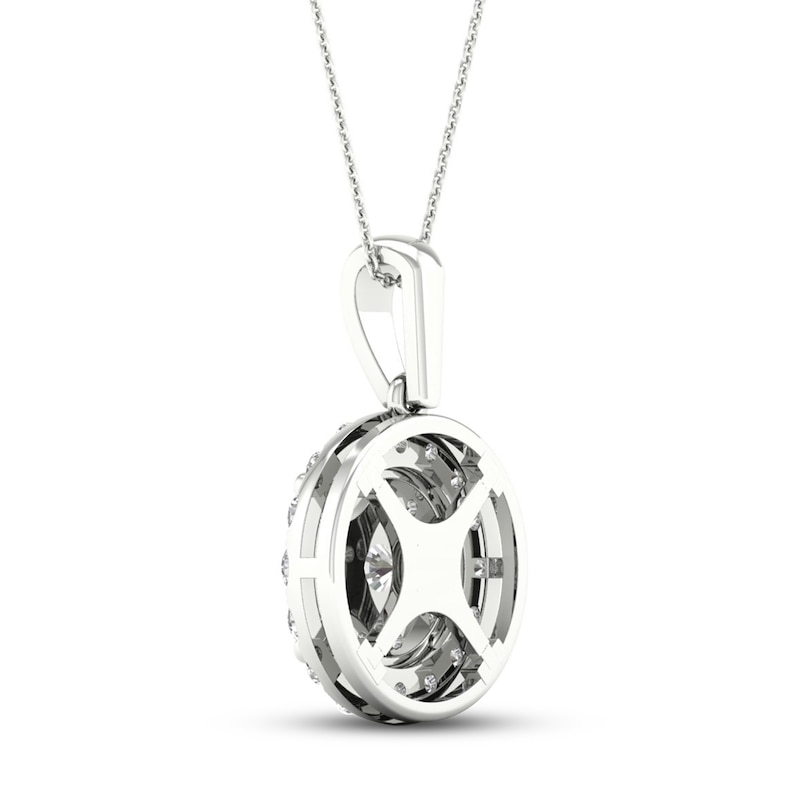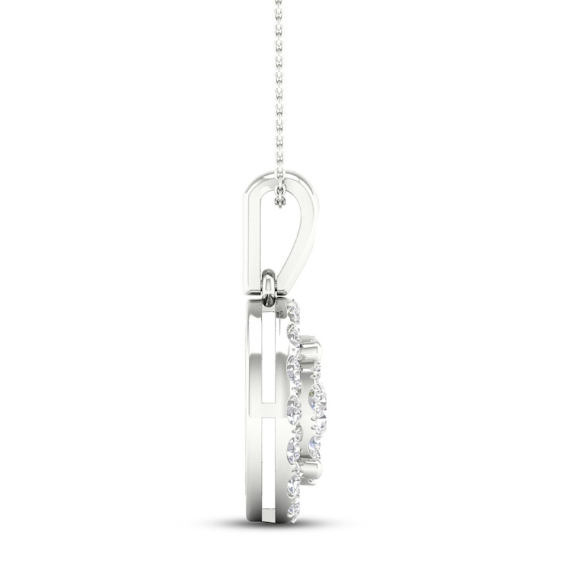 This gorgeous diamond necklace is destined be a timeless treasure. A captivating cluster of bright round-cut diamonds shines even brighter amidst a sparkling surround of more round diamonds emitting a dazzling display of sparkle. The necklace is fashioned in iconic 10K white gold with a total diamond weight of 1 carat. The pendant suspends from an 18-inch cable chain and secures with a spring-ring clasp.