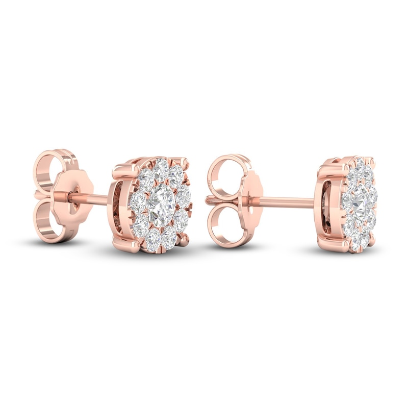 These beautiful diamond earrings are destined to be a timeless treasure. Radiant round-cut diamonds emit a dazzling display of sparkle amidst a sparkling halo of more round diamonds. Fashioned in iconic 10K rose gold, the earrings have a total diamond weight of 1 carat and secure with friction backs.