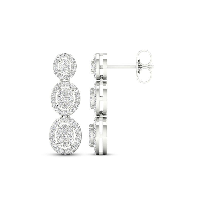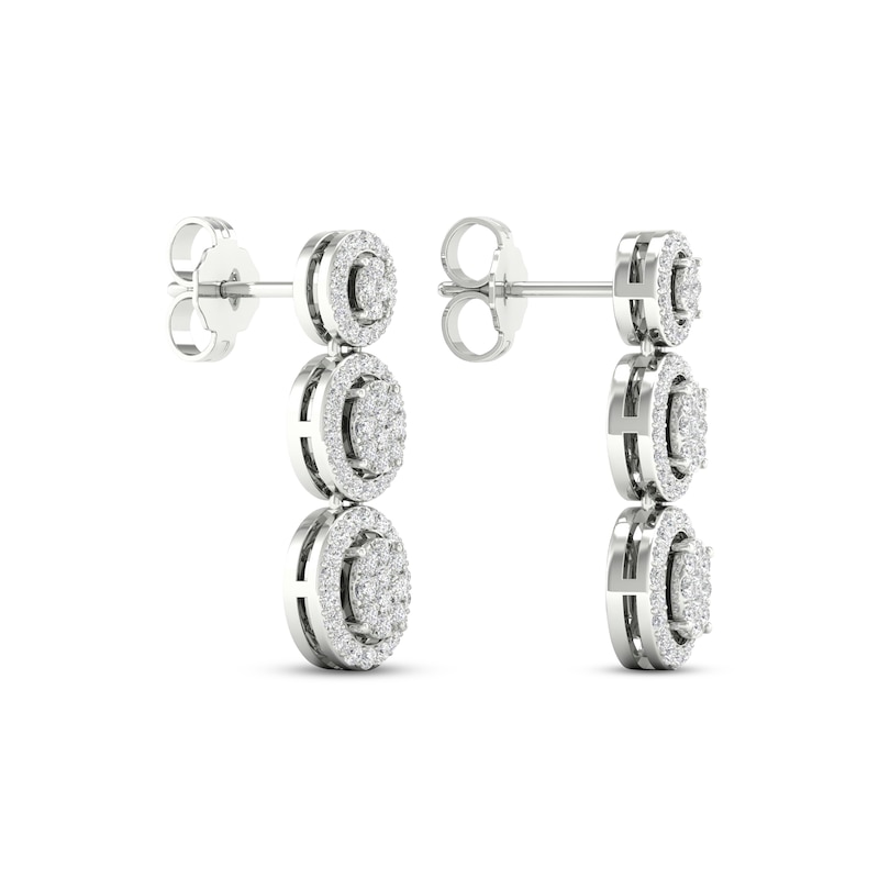 These eye-catching drop earrings showcase three oval-shaped clusters of brilliant round-cut diamonds, which graduate gently in size from top to bottom. Each cluster is haloed by more round diamonds for a total diamond weight of 1/2 carat. The exquisite earrings are styled in 10K white gold and secure at the post with friction backs.