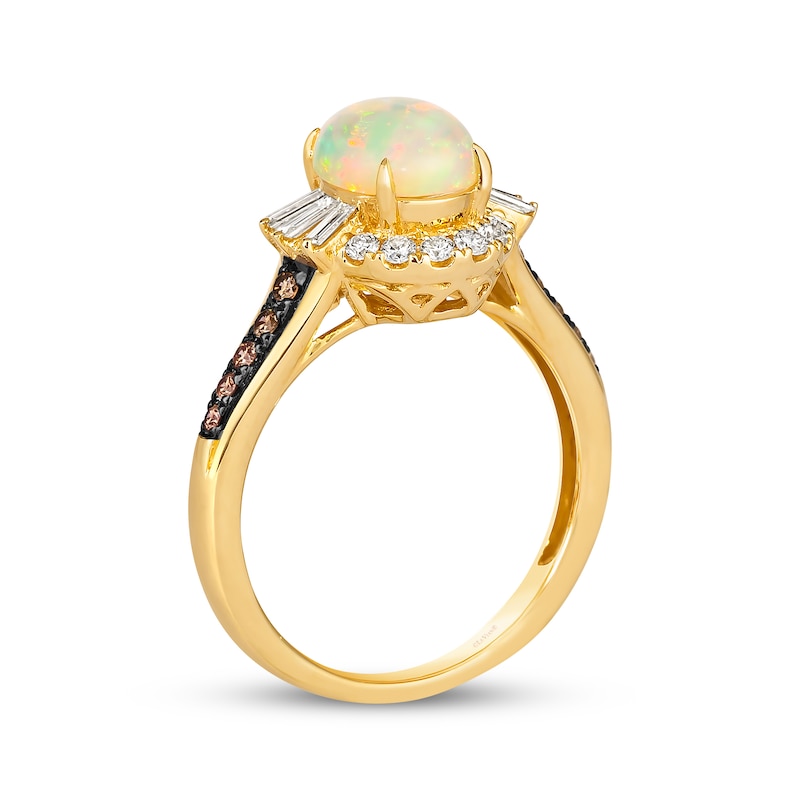 A delicious oval-cut Neopolitan Opal™ cabochon shimmers at the center of this beautiful ring from Le Vian®. Luscious baguette- and round-cut Vanilla Diamonds® frame the opal, and rich round Chocolate Diamonds® line each side of the band for a total diamond weight of 1/2 carat. The ring is crafted in sweet 14K Honey Gold™. Le Vian®. Discover the Legend. This ring is available in limited sizes. If you don't see your size here, please visit a store to order your ring.