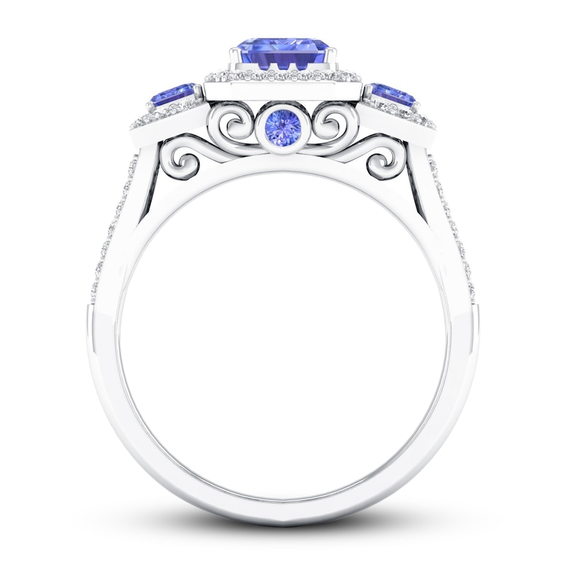 This striking engagement ring features bright emerald-cut tanzanite in the center and sides to make it truly stand out. Framing each tanzanite gemstone are lovely round diamonds that also grace the 10K white gold band, bringing the ring's total diamond weight to 1/3 carat. From the Now & Forever® bridal collection.